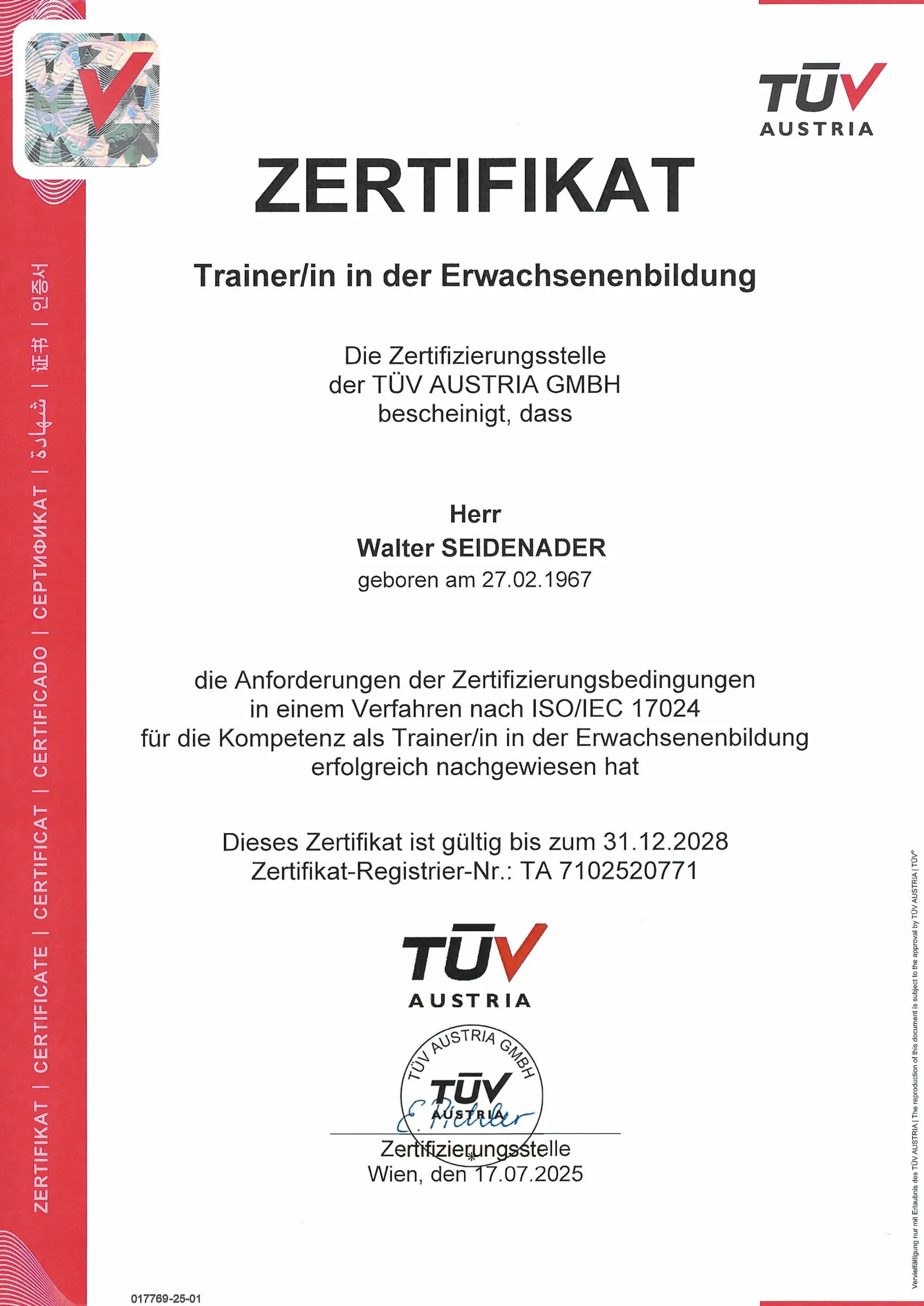 Ich bin TÜV-zertifizierter Trainer in der Erwachsenenbildung sowie Personal- & Business-Coach nach ISO/IEC 17024 und bringe über 40 Jahre Berufserfahrung in Handel, Verwaltung und Unternehmensführung mit. Was mich auszeichnet, ist die einzigartige Kombination aus strategischem Weitblick, analytischem Denken und einer ausgeprägten Hands-on-Mentalität. Ich kenne nicht nur die Theorie – ich habe in der Praxis bewiesen, wie nachhaltige Veränderung gelingt.